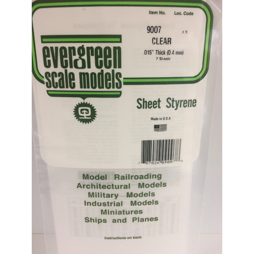 Evergreen Scale ModelsEvergreen 9007 Clear Sheets Clear (0.015in) 0.38 x 150 x 300 mm.015" (.38mm) THICK CLEAR SHEETS.ORIENTED POLYSTYRENE FOR EXCELLENT VISUAL CLARITY.E...