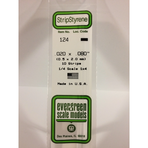 Evergreen Scale ModelsEvergreen 124 Strip 0.020 x 0.080 x 14 in (0.50 x 2.0 x 350 mm).020" X .080" X 14" / .50mm X 2.0mm X 35cmEvergreen Scale Models is the world's lar...