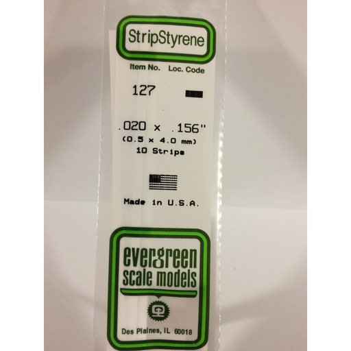Evergreen Scale ModelsEvergreen 127 Strip 0.020 x 0.156 x 14 in (0.50 x 4.0 x 350 mm).020" X .156" X 14" / .50mm X 4.0mm X 35cmEvergreen Scale Models is the world's lar...