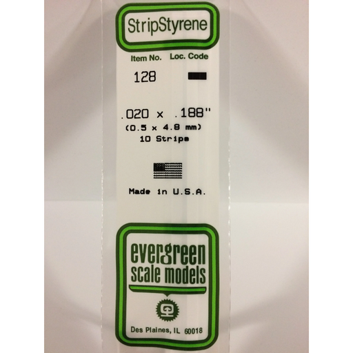 Evergreen Scale ModelsEvergreen 128 Strip 0.020 x 0.188 x 14 in (0.50 x 4.8 x 350 mm).020" X .188" X 14" / .50mm X 4.8mm X 35cmEvergreen Scale Models is the world's lar...
