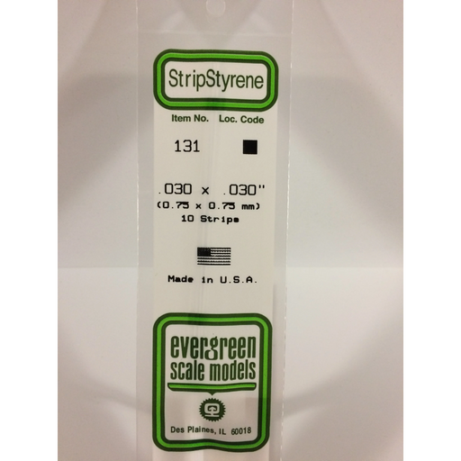 Evergreen Scale ModelsEvergreen 131 Strip 0.030 x 0.030 x 14 in (0.75 x 0.75 x 350 mm).030" X .030" X 14" / .75mm X .75mm X 35cmEvergreen Scale Models is the world's la...