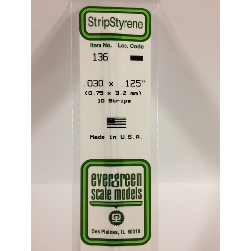 Evergreen Scale ModelsEvergreen 136 Strip 0.030 x 0.125 x 14 in (0.75 x 3.2 x 350 mm).030" X .125" X 14" / .75mm X 3.2mm X 35cmEvergreen Scale Models is the world's lar...