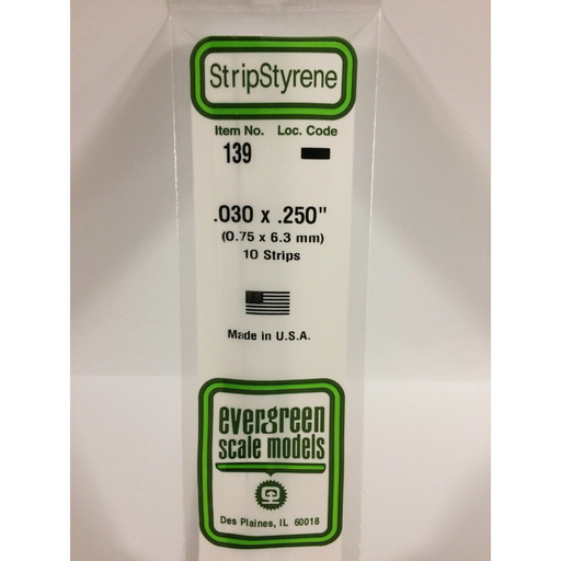 Evergreen Scale ModelsEvergreen 139 Strip 0.030 x 0.250 x 14 in (0.75 x 6.3 x 350 mm).030" X .250" X 14" / .75mm X 6.3mm X 35cmEvergreen Scale Models is the world's lar...