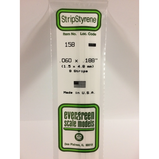 Evergreen Scale ModelsEvergreen 158 Strip 0.060 x 0.188 x 14 in (1.5 x 4.8 x 350 mm).060" X .188" X 14" / 1.5mm X 4.8mm X 35cmEvergreen Scale Models is the world's larg...
