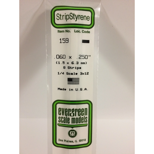Evergreen Scale ModelsEvergreen 159 Strip 0.060 x 0.250 x 14 in (1.5 x 6.3 x 350 mm).060" X .250" X 14" / 1.5mm X 6.3mm X 35cmEvergreen Scale Models is the world's larg...