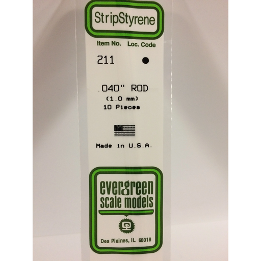 Evergreen Scale ModelsEvergreen 211 Round Rod 0.040 x 14 in (1.0 x 350 mm).040" OD X 14" / 1.0mm X 35cmEvergreen Scale Models is the world's largest producer of polysty...