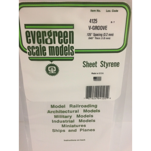 Evergreen Scale ModelsEvergreen 4125 V-Groove Siding White (0.040in) 1.0 x 150 x 300 mm.040" (1.0mm)THICK X .125"( 3.2mm) GROOVE SPACING X .21" (.53mm) GROOVE WIDTH. GRO...