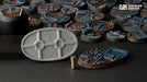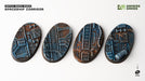 This blister contains 4 thermoplastic 60mm wide oval Battle Ready Bases, in a Spaceship Corridor theme.