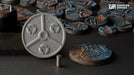 This blister contains 3 thermoplastic 50mm wide round Battle Ready Bases, in a Spaceship Corridor theme.