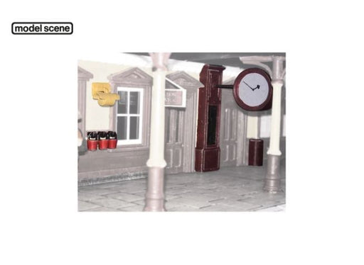 ModelsceneMODELSCENE OO/HOPLATFORM ACCESSORIES STEAM ERAPack contains simple kits to make 1 large Station Clock, 1 Litter Bin, 3 Fire Buckets and Rack, 4 Tan...