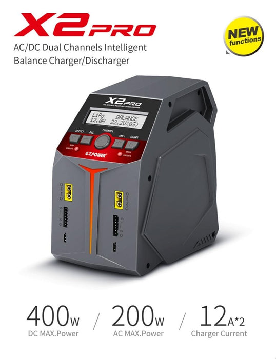 This G.T. Power X2 PRO V2 AC/DC Dual Channel Intelligent Balance Charger & Discharger. Multifunctional, all-in-one smart charger. Two individual outputs, with the possibility of simultaneous charging using Smart Distribution or Equal Distribution.