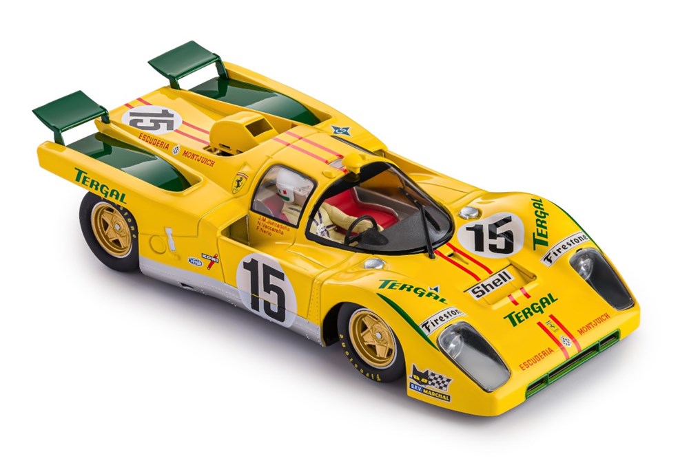 The Ferrari 512M was a development from the previous year’s 512S and only raced during the 1971 WSC season. It was produced primarily to race at Le Mans, where Ferrari had no less than 8 M versions a single 512S Spyder to go head-to-head with the Porsche 917. This is the privately entered car #15 of the Spanish Escuderia Montjuich team driven by Vaccarella / Juncadella and this high performing slot car would make a welcome addition to any Ferrari collection or of cars that raced at Le Mans.