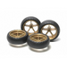 ★This set pairs lightweight 5-spoke wheels molded in a gold color with 10mm width arched tires. ★Contains two each of front rear tires and wheels. ★Some bodies may require modification.